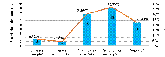 En cuanto a la edad, el grupo etario de las mujeres entre 20 y 30 años (19 féminas) se ubicó en primer lugar, seguido por el grupo de 31 a 35 años (18 mujeres). Este último aspecto es un hallazgo positivo, porque 37 de las 49 madres se encontraban en una edad idónea para el embarazo. Con respecto a la escolaridad, el 22,4% de las madres tienen un título universitario, quedando las demás ubicadas en bajos niveles de escolaridad. Este es otro dato importante, por cuanto, a mayor nivel escolar, mejor preparación para enfrentar un embarazo y cumplir las medidas que ayudan a tener un parto a término feliz. A esto se une que el 57,14% de esas madres trabajan en el hogar y el 22,45% aún están estudiando. Por tanto, es relevante resaltar que en el 63,3% de los hogares el ingreso per cápita esté por debajo del básico del país, lo que influye en la alimentación y en todos los cuidados prenatales, tan necesarios para evitar partos pretérminos.