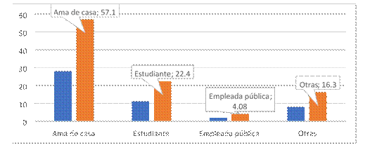 En el gráfico 2 se presenta la ocupación de las madres de los neonatos estudiados. Como se puede apreciar el 57,14% trabajan en el hogar, 11 (22,45%) aún están estudiando, el 16,33% tiene empleos varios y 2 madres son trabajadoras públicas.