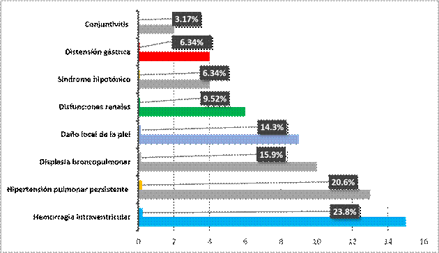 Las complicaciones que se presentaron en los neonatos se muestran en gráfico 5. Se puede observar que el 23,8% de los recién nacidos presentaron hemorragia intraventricular, el 20,6% sufrió de hipertensión pulmonar persistente, el 15,9% padeció de displasia broncopulmonar; en el 14,30% se presentaron lesiones en la piel, el 9,52% tuvo disfunción renal y en menores porcentajes se presentaron el síndrome hipotónico y la distención gástrica (6,34% en ambas) y conjuntivitis (3,17%). El resumen estadístico descriptivo indica que la media de complicaciones está en el orden casi 8 complicaciones para una muestra similar a la aquí utilizada, aunque la desviación estándar, con un nivel de confianza del 95,0%, fue de s=4,64. Muchas de las complicaciones que se presentaron son prácticamente incompatibles con la vida.