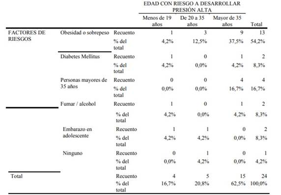 En la tabla 2, entre la relación cruzada que existe de los factores de riesgos y la edad más predisponentes a desarrollar presión alta, tenemos que 62,5% son las mujeres mayores de 35 años; el 20,8% de 20 a 35 años y el 16,7% las menores de 19 años. Mientras los factores de riesgo que más sobresalen, son las mujeres con obesidad y sobrepeso siendo el 54,2%. La cual, si existe una relación estadísticamente significativa entre las variables, ya que la edad y obesidad son factores de riesgo para desarrollas trastornos hipertensivos