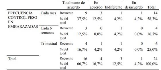 En la tabla 3, entre las actitudes que toman las embarazadas en cuanto si es beneficioso para su salud en llevar un peso adecuado, tenemos que el 66,7% están totalmente de acuerdo; 16,7% en acuerdo; 12,5% indiferente y solo el 4,2% están en desacuerdo, lo que se concluye que existen una buena actitud frente a los riesgos a desarrollar trastornos hipertensivos. En cuanto al conocimiento de la frecuencia del control del peso, tenemos que el 58,3% lo hacen cada mes, lo que existe una relación entre las variables en mitigar el riesgo de desarrollar de esta patología.