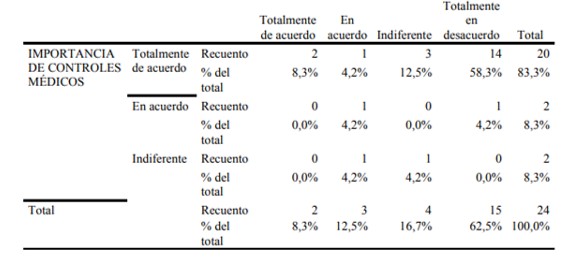 En la tabla 4, entre la relación de la importancia de los controles médicos y si creen que es una pérdida de tiempo acudir al mismo, tenemos que el 62,5% refirieron que están totalmente en desacuerdo que es una pérdida de tiempo; el 16,7% indiferente; 12,5% en acuerdo y el 8,3% totalmente de acuerdo. Y en cuanto a la importancia de los controles médicos, tenemos que el 83,3% refirió que están totalmente de acuerdo que son importantes los controles. Entonces, existe una relación significativa entre las variables y una buena actitud de las embarazadas en mitigar los riesgos en desarrollar trastornos hipertensivos.