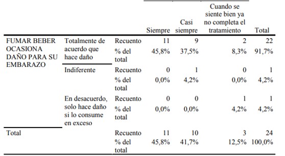 En la tabla 5, entre la relación las prácticas y actitudes que toman para disminuir el desarrollo de trastornos hipertensivos, se tiene que el 91,7% están totalmente de acuerdo que fumar, beber alcohol u otras sustancias ocasionan daño a su embarazo; el 4,2% en desacuerdo e indiferente; en cuanto a la práctica que realizan, tenemos que el 45,8% siempre cumple con todas las prescripciones médicas indicadas por su profesional de salud; el 41,7% casi siempre y el 12,5% cuando se sienten bien ya no cumplen con lo indicado. La cual si existe una relación estadísticamente significativa entre las variables. Una vez obtenido la validación del juicio de expertos, se aplicó el cuestionario en un plan piloto con limitaciones por la emergencia sanitaria del COVID 19 que atraviesa a nivel mundial. Se compararon los resultados obtenidos entre los dos tipos de investigación con la finalidad de llegar a una sola conclusión. En la entrevista se observó que las embarazadas son de edades menores de 20 años y con un déficit conocimiento del tema de investigación.