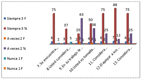 Los resultados estadísticos se presentan en gráficos deducidos de la información relacionada con la variable, indicadores y preguntas aportadas por las enfermeras que laboran en la Dirección Estatal de Programas de Salud, con sus respectivas respuestas en forma de promedios porcentuales en cada una de las frecuencias observadas, de acuerdo a las diferentes alternativas de respuestas.