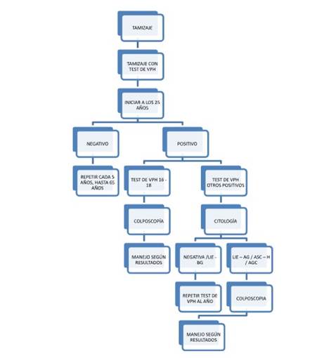 El tamizaje con test de VPH se realiza a las mujeres de 25 años hasta los 65 años de edad, en el caso de que el resultado sea reportado como negativo se debe realizar misma prueba cada 5 años hasta que la paciente llega a una edad de 65 años.