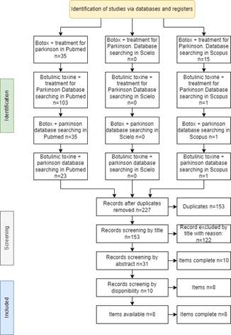 In four of the articles, it is stated that botulinum toxin (BoNT) is produced by the bacterium Clostridium botulinum, which promotes the blockade of the release of the neurotransmitter acetylcholine, “which will mainly cause movements or, in turn, paralysis in the upper extremities such as the hands, originating in most cases, followed by the lower extremities. For this reason, due to the application of Botulinum Toxin Type A and Type B, with Type A being the most used due to its high effectiveness, it has become very helpful in treating abnormal movements in Parkinson's disease. Botulinum toxin has a wide range of benefits, being considered an effective treatment for disorders involving abnormal movements or tremors. However, although it is considered a quite safe treatment without notable adverse effects, it should be considered that it is not a fully viable treatment due to its many limitations regarding its short duration response and high cost.