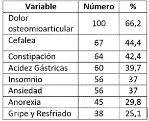 Los resultados de la tabla. 1 demuestra que los dolores en el sistema osteomioarticular con 100 casos representando el 66,2 % es la principal causa por la cual este grupo poblacional consume medicamentos sin prescripción médica; seguido de la cefalea con un total 67, para un 44,4%. Este resultado tiene gran relación con el proceso de deterioro que sufren los (AM) como parte del proceso de envejecimiento, por el mal funcionamiento de las células o por falta de recuperación de ellas que ocasiona cambios en la forma y constitución del cuerpo (11).