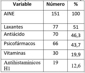 El principal grupo de fármaco que consumen sin prescripción médica es AINE con el 100 %, seguido de los laxantes con 51