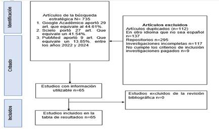 PRISMA facilita la identificación, selección y evaluación de los estudios incluidos en una revisión sistemática, al mismo tiempo que permite justificar las decisiones tomadas durante el proceso. Mediante el uso de una lista de verificación y un diagrama de flujo, esta matriz ayuda a minimizar los sesgos en la búsqueda y análisis de la literatura científica, fortaleciendo la validez de los hallazgos. Además, promueve la replicabilidad del estudio por parte de otros investigadores, lo cual es esencial para consolidar el conocimiento basado en evidencia. Este procedimiento se estructuró en cuatro fases principales: identificación, cribado, elegibilidad e inclusión, garantizando un proceso transparente, ordenado y replicable (Figura 1).