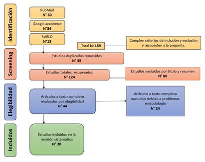 En la etapa de "Elegibilidad", 44 artículos a texto completo fueron evaluados para determinar su elegibilidad. De estos, 24 artículos fueron excluidos debido a problemas metodológicos, indicando que no cumplían con los estándares de calidad o diseño requeridos para la revisión. La evaluación de la calidad metodológica es un pilar de las revisiones sistemáticas, ya que estudios de baja calidad pueden introducir sesgos y afectar la validez de los hallazgos. Según Veloz y González (6), en el Manual Cochrane de Revisiones Sistemáticas de Intervenciones, una evaluación rigurosa de la calidad metodológica es fundamental para la credibilidad de los resultados de una revisión. Finalmente, la fase de "Incluidos" muestra que 20 estudios fueron seleccionados e incluidos en la revisión sistemática. Este número representa el conjunto de artículos que cumplen con todos los criterios de inclusión y exclusión, y que serán utilizados para el análisis y la síntesis de resultados. La transparencia en esta fase final es vital para la replicabilidad de la revisión, permitiendo a otros investigadores comprender cómo se llegó a la selección final, tal como se recomienda en las guías de reporte para revisiones sistemáticas (7).