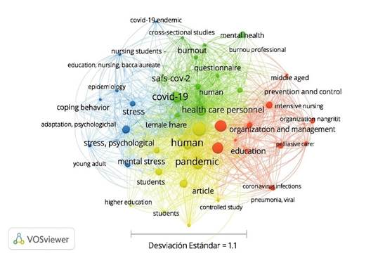 También conduce a investigaciones relacionadas con la Depresión, como una de las manifestaciones más comunes dentro del ámbito laboral y familiar de los estudiantes de enfermería durante la pandemia COVID-19. El segundo grupo, representado por el color azul, agrupa las publicaciones que tratan temas relacionados con el estrés, a partir de investigaciones sobre adaptación psicológica a las enfermedades profesionales derivadas de este trastorno.