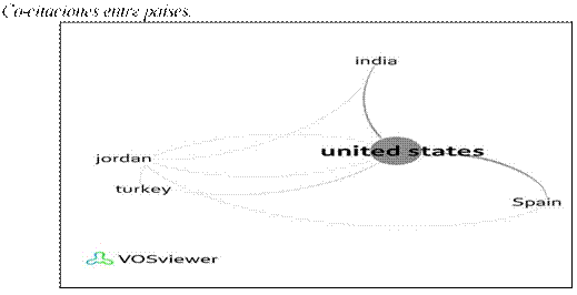 En esta figura se muestra cómo Estados Unidos, España e India, que son precisamente los tres países con mayor volumen de publicaciones, también han formado un subconjunto de artículos en coautoría, y por otro lado Jordania, Turquía y China. Jordania comparte el cuarto lugar con China presentando también dos publicaciones, entre las que se encuentra la titulada ―Estrés y cambios de comportamiento con exámenes electrónicos remotos durante la pandemia de COVID-19: un estudio transversal entre estudiantes de ciencias médicas‖ (Elsalem et al., 2020) que tuvo como objetivo evaluar la experiencia de los estudiantes con los exámenes electrónicos remotos durante la pandemia de COVID-19 en la población de alumnos de Ciencias Médicas en Jordania.