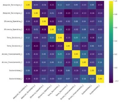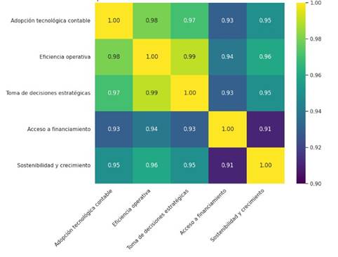 Los análisis de correlación muestran unos coeficientes bimuy altos de algunas dimensiones y subindicadores del estudio (r > 0,99), lo que apunta a una alta colinealidad entre las dimensiones y variables analizadas. Esta alta colinealidad no invalida los resultados del estudio, ya que este tiene un carácter asociativo y descriptivo, dado que se trata de una relación entre constructos que se presentan como conceptualmente asociados; la alta colinealidad se justifica por el propio diseño del instrumento, en el sentido que las dimensiones analizadas eficiencia operativa, toma de decisiones estratégicas, acceso a financiamiento y sostenibilidad empresarial proceden de un mismo proceso estructural: la adopción de tecnologías contables digitales. Por tanto, los coeficientes elevados apuntan a una alta consistencia interna del instrumento y a una relación de interdependencia funcional entre los componentes del modelo analítico, más que a un problema estadístico de redundancia. Aun así, se considera que en futuros estudios de carácter predictivo o explicativo se debería recurrir a técnicas adicionales de control de la colinealidad o a modelos multivariantes más complejos.