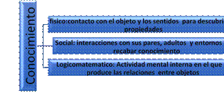 Samuel et al., (2015) plantean que la enseñanza y el aprendizaje, desde los primeros años de vida es primordial para formar cimientos en el desarrollo de la inteligencia de cada niño, por lo que es necesario brindar oportunidades donde pueda observar, experimentar y donde sean capaces de procesar información e incorporar conocimientos.(León y Medina, 2016; Beresaluce, ob cit). En este orden de ideas, Piaget ob cit., distingue tres tipos de conocimientos: el físico, que se refiere al contacto entre el objeto y los sentidos para descubrir las propiedades de su entorno; el social, cuyas interacciones con su entorno y sus pares sirven para obtener la información y finalmente, el lógico matemático, como actividad mental donde converge dichas relaciones, tal como se observa en la figura 3. Figura 3.Tipos de conocimiento según Piaget