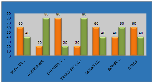 Atendiendo a lo expresado en el gráfico 1, entre los recursos didácticos utilizados por los docentes para propiciar el aprendizaje del idioma Jivi de manera regular está representado por un 80% sopa de letra, cuentos y leyenda; memoria el 60%, rompe cabeza el 40% y/o el trabalenguas y las adivinanzas el 20%. Por consiguiente, a la hora de desarrollar la propuesta se consideraron estas estrategias para representarla en el recurso tecnológico multimedia. Otro aspecto, que fue clave para el desarrollo del prototipo fue que más del 80% de los entrevistados recomendaron considerar los aspectos culturales que identifican, caracterizan y describen al pueblo Jivi.
