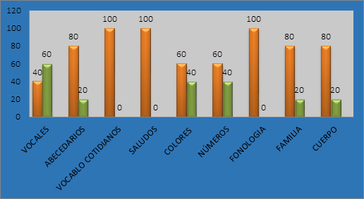 En el gráfico 2 se muestra que entre los contenidos que obtuvieron el 100%, se encuentran los vocablos cotidianos, saludos, la fonología, el abecedario y las partes del cuerpo humano, mientras los temas relacionados con la familia conforman el 80%, quedando con un 40% temas como los colores, números y vocales. En tal sentido, se concluye que la Educación Intercultural Bilingüe, constituye un proceso, cuya base se centra en los conocimientos, valores y culturales, idioma, simbología, cosmovisión y prácticas pedagógicas de los pueblos indígenas, al objeto de ir fortaleciendo y ampliando la cultura propia, que al mismo tiempo promueve la apropiación en forma crítica de los conocimientos y técnicas de la cultura no indígena, a través de una interacción intercultural. Pudiendo lograrse como se refleja en el estudio de Figueroa-Saavedra et al.,(2014), que refleja el incremento en un 150% de la producción de trabajos escritos en lenguas indígenas originarias mexicanas frente a trabajos escritos en lengua española al comparar la producción de los mismos entre los periodos 2005-2009 y 2008 a 2012, lo que los autores de esa investigación consideran que resulta un valuarte para el proceso de enseñanza y aprendizaje el evaluar a estos estudiantes empleando sus lenguas originarias (L1) , sin incurrir en el error de evaluar en vez del aprendizaje a través de la traducción al castellano que constituye su segunda lengua (L2).