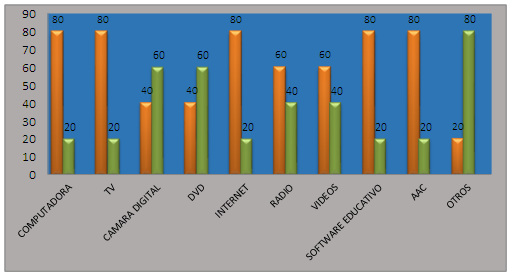 En el gráfico 3 se expresa, que recursos como la computadora, televisor, software, internet y AAC son los recursos técnicos, informativos y computarizados que el docente consideraba con mayor frecuencia representando un 80%; el 60% lo conforma los medios de comunicación como lo son la radio, televisión y el 20%, por otros recursos. De igual forma, el 80% de la población era de la opinión que la utilización de un software como herramienta tecnológica sería de gran utilidad. Al respecto Río-Colmenárez ob cit., expresa que si bien hay un marco legal que sustenta la enseñanza de los idiomas indígenas en los Países de América Latina, es necesario optimizar las condiciones de acceso a internet de las comunidades, dar el salto a una currícula que facilite la comunicación de los educandos en su lengua originaria, y producir materiales apoyados en las TIC donde se elimine la foklorización de la enseñanza de las lenguas indígenas y su cultura, promoviendo el cambio de la mirada hacia lo indígena como una cultura con conocimientos propios.
