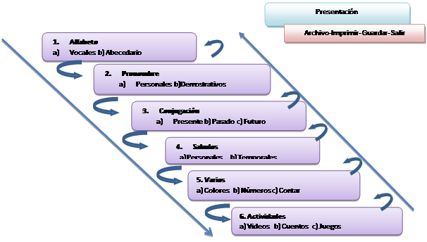 Se tomó como guía los principios para la planificación de libros en serie de Castillo (1981). Éstos se adaptaron para el prototipo denominado Software Educativo “El saber jivi”. Consta de una pantalla de presentación que orienta el material que se está manipulando, en la segunda pantalla denominada menú principal, presenta la estructuración del contenido, el usuario podrá seleccionar uno de los siete contenidos temáticos que siguen una estructura conceptual, que permita facilitar la coherencia del aprendizaje. El segundo principio se utilizó la articulación: en un sentido vertical, existe una continuidad entre cada uno de los temas que se desarrollan en la herramienta tecnológica. A su vez, cada contenido tiene actividades de motivación que guardan relación absoluta con el tema estudiado con anterioridad. En un sentido horizontal, se integrarán áreas del conocimiento tales como informática, matemática, ciencias sociales, educación para el trabajo, cultura y artes. Y por último, tenemos la secuencia: que se realizó basándose en el desarrollo de un esquema de aprendizaje del idioma Jivi. La espiritualidad en concordancia con la secuencia, el contenido se suministró de forma continua y gradual, dosificando actividades teóricas e instando a la práctica y la investigación. El material se distribuyó en un Menú Principal, de donde el usuario podía acceder de todos los contenidos que permita progresivamente reconocer los elementos básicos del idioma. También se localizaba el Sub menú para cada contenido, que permitirá manipular la información de diferente manera utilizando como recurso la imagen, sonido, actividades, juegos, cuentos, entre otros. Todo esto se representó en el cartel de secuencia (Figura 1), donde se puede apreciar claramente el esquema en que fue organizada la temáticamente del prototipo.