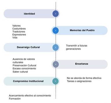 A continuación, en el gráfico 1 se muestran las cinco (5) categorías emergentes: identidad, memorias del pueblo, desarraigo cultural, enseñanza y compromiso institucional, de las cuales se desprendieron trece (13) subcategorías deducidas de la información aportada por los informantes.