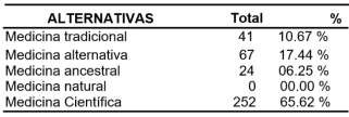 Conforme a los datos recabados en la encuesta, la mayoría (65,62%) opina que el personal de enfermería aplica estadísticas predominantemente en el contexto de la medicina científica dentro del centro de salud. En contraste, un 17,44% cree que se utiliza en la medicina alternativa, mientras que un 10,67% percibe su aplicación en la medicina tradicional