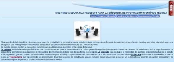 Higher Medical Education is in accordance with the accelerated improvement of Information and Communications Technologies (ICT) and advances in the computerization process of the health sector. For these reasons, a technological innovation investigation was carried out with the purpose of resolving the insufficiencies detected in the TeachingLearning Process of the subject Research Methodology and Statistics for the development of skills in the search for scientific-technical information with the use of the telematic network. The objective of this article is the development of educational software to enhance knowledge about the use of the services provided by the Telematics network for the search for scientific-technical information in the aforementioned subject for secondyear students of the Dentistry career. the University of Medical Sciences of Santiago de Cuba. The investigation went through three stages; one aimed at substantiating the conceptual theoretical framework and current state of the use of the services provided by the Telematics network for the search for scientific-technical information, the second at designing software and the third at validating multimedia. The CrheaSoft tool was used, programmed on free software using PHP, MySQL, extjs 2.2, JQuery. Reaching the conclusion that the REDESOFT educational Multimedia enables students of the Stomatology career with the information provided to deepen the contents presented for both the teacher and the student.