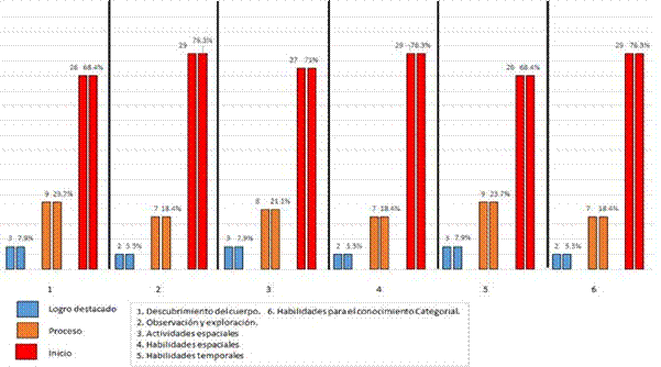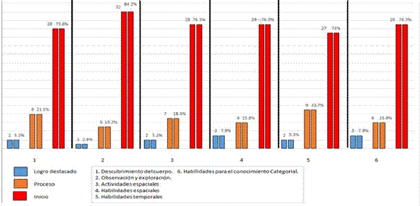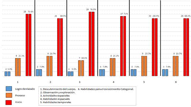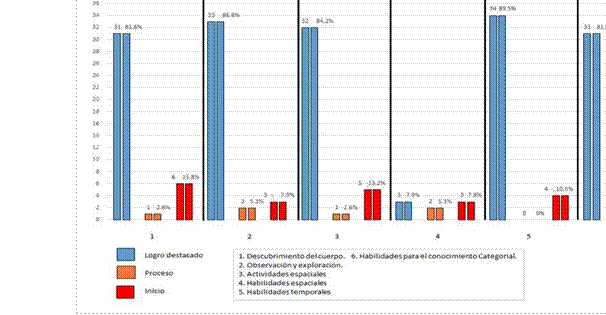 En cuanto a la dimensión descubrimiento del cuerpo se tiene que el 5.3% de los niños se encuentran en el nivel de logro destacado, mientras que el 18.4% de los niños estudiados se ubican en el nivel de proceso y el 76.3% de los niños observados se localizan en el nivel de inicio.
