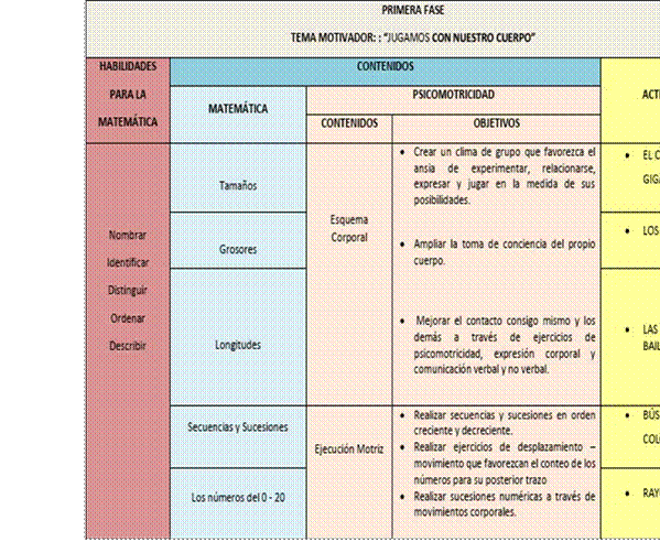 La primera fase denominada “Jugamos con nuestro cuerpo”, tiene como objetivo crear un clima que favorezca la necesidad de nombrar, identificar, distinguir, ordenar y describir a través de los movimientos las nociones de número y relaciones del área curricular de matemática e iniciarnos en el desarrollo del esquema corporal y la ejecución motriz mediante juegos variados.