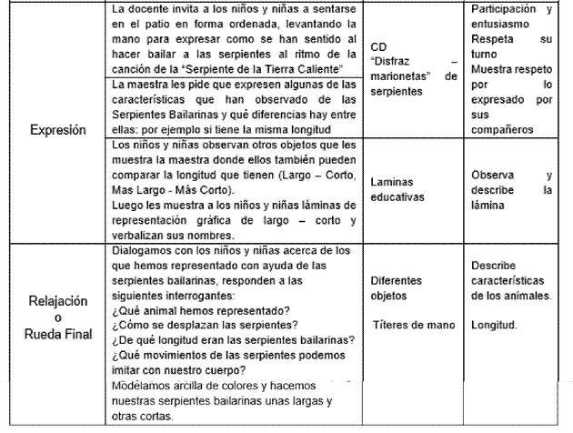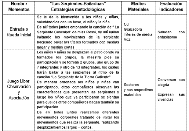 Cuadro 11. Desarrollo de la sesión de las serpientes bailarinas