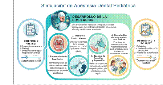 La enseñanza odontológica moderna reconoce la importancia de la simulación como estrategia de aprendizaje para el desarrollo de competencias clínicas en un entorno seguro. El entrenamiento mediante simuladores en procedimientos anestésicos ofrece una vía pedagógica segura para ejercitar la punción, el reconocimiento anatómico y habilidades psicomotoras, al reducir la interferencia de factores emocionales y conductuales característicos de la atención pediátrica real (1–3). En este marco, la simulación no solo contribuye a consolidar destrezas clínicas fundamentales, sino que también puede potenciar la autoconfianza del estudiante al transitar la formación preclínica.