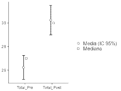 Nota. Pretest (M = 26.23, IC 95 % [25.19, 27.27], Mediana = 27); postest (M = 30.25, IC 95 % [28.97, 31.52], Mediana = 30).