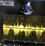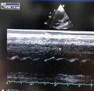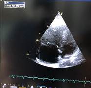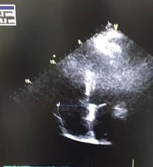 Bajo ese contexto sospechando TEP para confirmar el diagnóstico se realiza Angio-tc de vasos pulmonares (Fig.2 ), que mostro falta de captación de medio de contraste en arteria pulmonar derecha , en cuanto a los exámenes de laboratorio lo más relevante fue troponina 4,7630 u/l , dímero-d 54490,00 ng/ml , ferritina 27300,00 ng/ml. Se procedió a iniciar tratamiento fibrinolítico, que al no contar con r-tpa (alteplase) se usó estreptoquinasa 1.500.000 UI que fueron administradas de forma intravenosa en una hora, seguida de anticoagulación con enoxaparina, después se evidencio mejoría en la oxigenación y hemodinámica, a las 24 horas se realiza nuevo rastreo ecocardiográfico (Fig. 3) en el cual existe mejoría de función ventricular derecha.