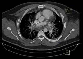 La angiografía por tomografía computarizada de tórax contrastada es el estándar de oro para el diagnóstico de la embolia pulmonar debido a su perfil de sensibilidad y especificidad, así como a su amplia disponibilidad en los hospitales. La ecocardiografía transtorácica debe de considerarse en pacientes de mayor riesgo con embolismo pulmonar, incluidos los pacientes con alta probabilidad según puntuación de Ginebra y la puntuación de Wells, pero con inestabilidad hemodinámica e incapacidad para trasladarse al departamento de imágenes y realizarse una angiotomografía de tórax. La ecocardiografía transtorácica proporciona una evaluación de la estructura y función del ventrículo derecho (VD), así como una evaluación de trombos en tránsito intracardíaco. El ventrículo derecho "anormal" puede incluir dilatación del corazón derecho, compresión del tabique interventricular, aumento de la regurgitación tricúspidea, hipocinesia del VD o presencia del signo de McConnell. La ecografía doppler de la pierna puede ser un método complementario para investigar la evidencia de trombosis venosa profunda cuando se sospecha un embolismo pulmonar y no se pueden realizar imágenes vasculares pulmonares. (9)