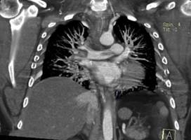 Figura 2. Angiotomografía pulmonar. Se evidencia no captación del medio de contraste en la arteria pulmonar derecha.