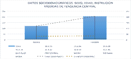 Medidas de tendencia central en datos socio demográficos, incluidos instrucción. Con una población de 325 personas conformadas según los datos sociodemográficos, según el sexo, está constituida por 120 mujeres, 205 hombres, con una media aritmética según el sexo por lo tanto en mujeres es de 30, mediana de 15, moda 5; mientras en hombres con una tendencia central de una media de 48,778, mediana de 30 y moda de 8.