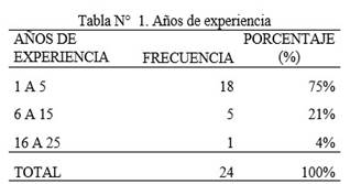En la encuesta aplicada con relación a los años de experiencia se encontró que el 75% presentan de 1 a 5 años de experiencia, un 21% de 6 a 15 años y un 4% de 16 a 25, como se muestra existe experiencia laboral en el área investigada.