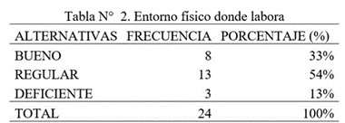 Los resultados de la encuesta aplicada a los trabajadores sobre el entorno físico manifestaron un 54% que el ambiente es regular y solo un 33% expresaron que era bueno, evidenciándose que en el ambiente de trabajo no existen condiciones adecuadas para el desempeño óptimo de sus labores diarias.