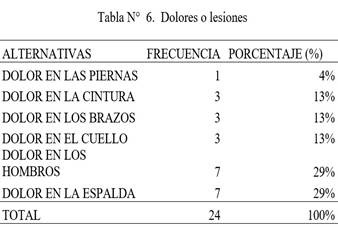 6.¿Principales dolores o lesiones que presenta debido al trabajo que realiza?