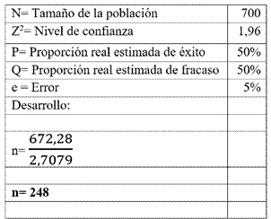 La población está constituida por 700 pacientes que asisten a consulta externa en el área de gastroenterología del Hospital General IESS Ceibos. El tamaño de la muestra es de 248 pacientes, la cual fue calculada a través de la siguiente fórmula.