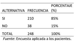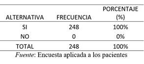 Sobre sí le transmiten responsabilidad y respeto los profesionales de enfermería el 100% respondieron que sí, evidenciando que esta responsabilidad de estos profesionales fue adquirida en su formación y con la experiencia, demostrando su obligación moral de cumplir con su deber en cuanto a la atención del paciente. Las enfermeras son las que tienen interacción más directa con el paciente. Poseen una mayor influencia en la satisfacción del paciente con los servicios de atención médica en comparación con otros profesionales (14). Adicionalmente, la satisfacción del paciente con la atención de enfermería también es imprescindible ya que se dice que el papel de la enfermera afecta todos los aspectos de la experiencia de hospitalización.
