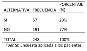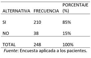 En relación con que sí recibía información sobre la evolución de su enfermedad por los profesionales de enfermería, el 77% de los pacientes respondieron que no lo que evidencia que la mayor parte del personal no les informa a sus pacientes sobre la evolución de la enfermedad aspecto importante para la recuperación adecuada de estos.