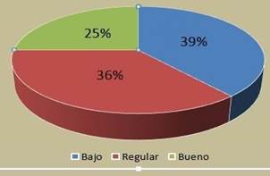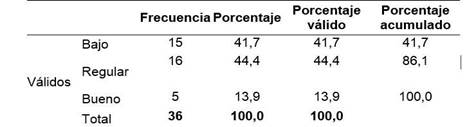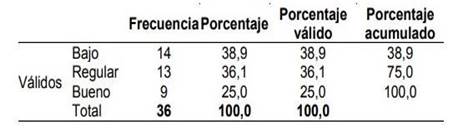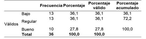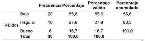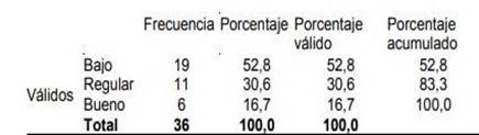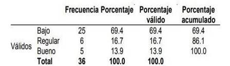 Se visualiza que de un total de 36 docentes evaluados con la encuesta relacionada a la variable desempeño docente, se han situado 14 docentes (38.9%) en el nivel bajo, 13 docentes (36.1%), se encuentran en nivel regular y 9 docentes (25%) en nivel bueno (tabla 1).