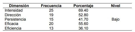 Al verificar el análisis de las dimensiones de la variable desempeño docente se observa que en la dimensión dirección (19) docentes, intensidad (25) docentes, eficacia (20) docentes, eficiencia (13) docentes, se ubican en nivel bajo y la dimensión persistencia (15) docentes en nivel regular lo que demuestra que existe un deficiente desempeño laboral. Dichos resultados coinciden con Jiménez ob cit. en su investigación acerca del Programa de Motivación en el desempeño laboral de los docentes de la Institución Educativa Melitón Carvajal de Lince 2017, cuyo objetivo fue la relación de incidencia del programa motivación en el desempeño laboral de los docentes. El cual concluye, que la aplicación del programa de motivación para el desempeño laboral de los docentes, mejoró significativamente, es decir a nivel emocional respondiendo a un trabajo bajo presión, como la mejora del desempeño docente en la dimensión pedagógica, lo que permite mejorar en su vida personal, logrando la capacidad de enfrentar los desafíos económicos, políticos, sociales y culturales.