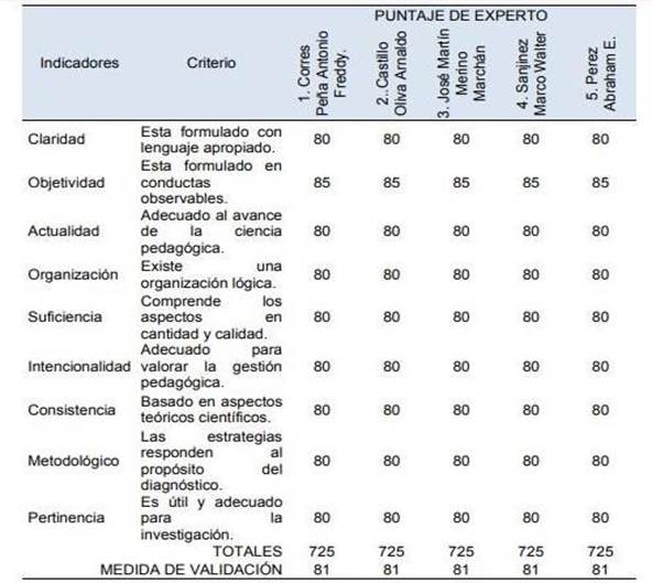 La validación por juicio de expertos del Programa Motivación Laboral para mejorar el desempeño de los docentes del Centro Educación Técnico Productivo N° 002 Tumbes se expresa en la tabla 8. Por lo que el juicio emitido por los profesionales permite validar esta propuesta con un puntaje ponderado de 81, considerando de esta forma que la motivación es un factor que tiene relación directa con el desempeño eficiente, por lo tanto, se ajusta a los parámetros de aplicabilidad.