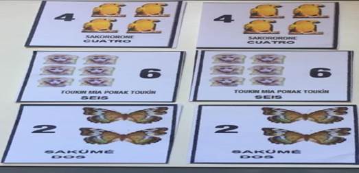 Observación: lo importante aquí no es el juego en sí, sino que este permite el contacto de los estudiantes con los números y la escritura de su lengua materna y la lengua dominante, lo que va a fomentar la posibilidad de diferenciar, conciliando las dos lenguas y participando colectivamente y obteniendo la satisfacción del aprendizaje.