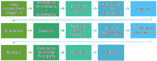 En todo caso, investigar debe representar “una búsqueda disciplinada de información, hecha por alguien, sobre cuya base pueda proponer una respuesta a alguna interrogante que por algún motivo le inquiete o le interese dilucidar” (González, 2000, p. 112). Martínez-Padrón, Bolívar Orellana y Harrington Martínez (2012) agregan que dicha búsqueda suele “nacer de un interés que bien puede ser la solución de problemas, la obtención de nuevos conocimientos o la necesidad de innovar” (p. 47), por lo que demanda de la realización de un proceso sistemático y comprometido que requiere la organización de tiempos y recursos sobre la base de procedimientos metodológicos que estén acordes con el fenómeno sometido a estudio. Por tanto, su carga intencional involucra un abanico de aspectos capaces de activar o inhibir las actuaciones de los protagonistas del proceso. Siendo así, la investigación carece de neutralidad y está marcada por facetas debidas a la planeación, desarrollo, consecución, fortalecimiento, publicación o difusión de los hallazgos, lo cual transita desde el surgimiento de las ideas iniciales que responden al interés indagatorio del investigador hasta decantar no solo en la concreción de un documento contentivo de los hallazgos y sus discusiones, sino en la publicación y difusión de tales hallazgos (ver Figura 1), lo cual no limita la utilidad que pudieran tener en la comunidad donde son leídos o utilizados como referenciales o como antecedentes.