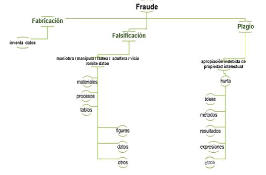 No teniéndose totalmente claro la gravedad e impacto que puede causar este tipo de mala conducta científica, sus desviaciones y el alcance de lo que se considera fraudulento, Judson (2006) se atreve a comentar sobre la necesidad de aproximarse y precisar lo que se conoce como fraude, apuntando a la consideración de los siguientes casos: (a) invención: fabrica los datos, a veces en su totalidad; (b) falsificación: manipulación de los datos obtenidos y seleccionando solo aquellos que favorezcan a la investigación, por ende, elimina los que producen resultados contrarios a lo deseado o a lo que contradiga a la teoría estatuida; y (c) plagio: se corresponde con “la apropiación indebida de la propiedad intelectual, el hurto de ideas, métodos y resultados de otro, y acaso también su expresión, al publicarlos bajo el nombre de uno mismo” (p. 19).