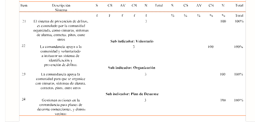 Para finalizar y según los resultados presentados en el cuadro 4, relacionados con la distribución de las frecuencias y porcentajes según la dimensión: Intervención Comunitaria e Indicador: Toma de Decisiones, al respecto, el subindicador: Sistema, refleja las respuestas emitidas por la muestra escogida de funcionarios en la Comandancia de San Francisco de Asís. En este sentido, el total de los encuestados, es decir, el 100% respondió que la prevención de delitos nunca ha sido controlada por la comunidad de manera organizada, ni con cámaras, ni sistemas de alarma, ni cornetas, pitos u otros mecanismos.