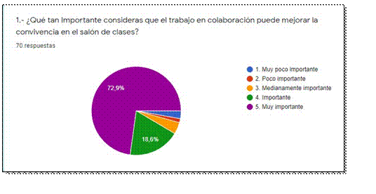 El 72.9% de los estudiantes encuestados consideran que el trabajo colaborativo puede mejorar la convivencia en el salón de clase puesto que esta estrategia de trabajo permite dinamizar los procesos áulicos a través de la interacción social, contrastando con un porcentaje bajo que lo observa como poco importante (Gráfico