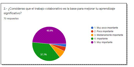 Un 48.6% y un 37.1% de los estudiantes encuestados consideran que el trabajo colaborativo es la base para mejorar el aprendizaje, contrastando a un porcentaje bajo que lo cree poco importante, porque mediante esta interacción se produce la mediación de los aprendizajes para alcanzar una zona de desarrollo potencial como lo plantea Vigotsky en su enfoque sociocultural (Gráfico Nº2).