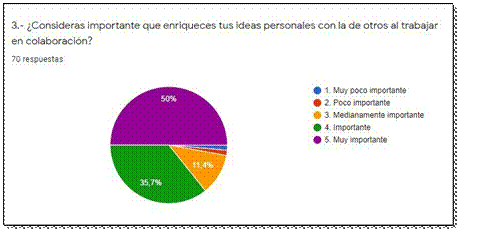 El 50% y 37% de la población investigada consideran importante el trabajo colaborativo porque enriquecen sus ideas, esto se debe a que a través de la interacción los estudiantes intercambian saberes y experiencias, ampliando sus conocimientos, esto contrastado con un porcentaje mínimo que opina que es poco importante (Gráfico Nº3).